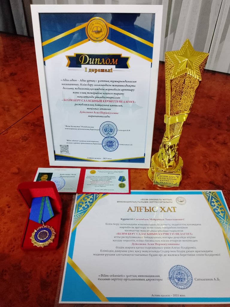 📜 Орыс тілі мен әдебиеті пәнінің мұғалімі, педагог-шебер, Ыбырай Алтынсарин медалінің иегері – Дүйсенова Асия Пермекуловна Республикалық байқауға қатысып, оның қорытындысы Астана қаласында KazMedia концерт залында Тәуелсіздік күніне орай салтанатты түрде марапаттау ұымдастырылып, өтті.